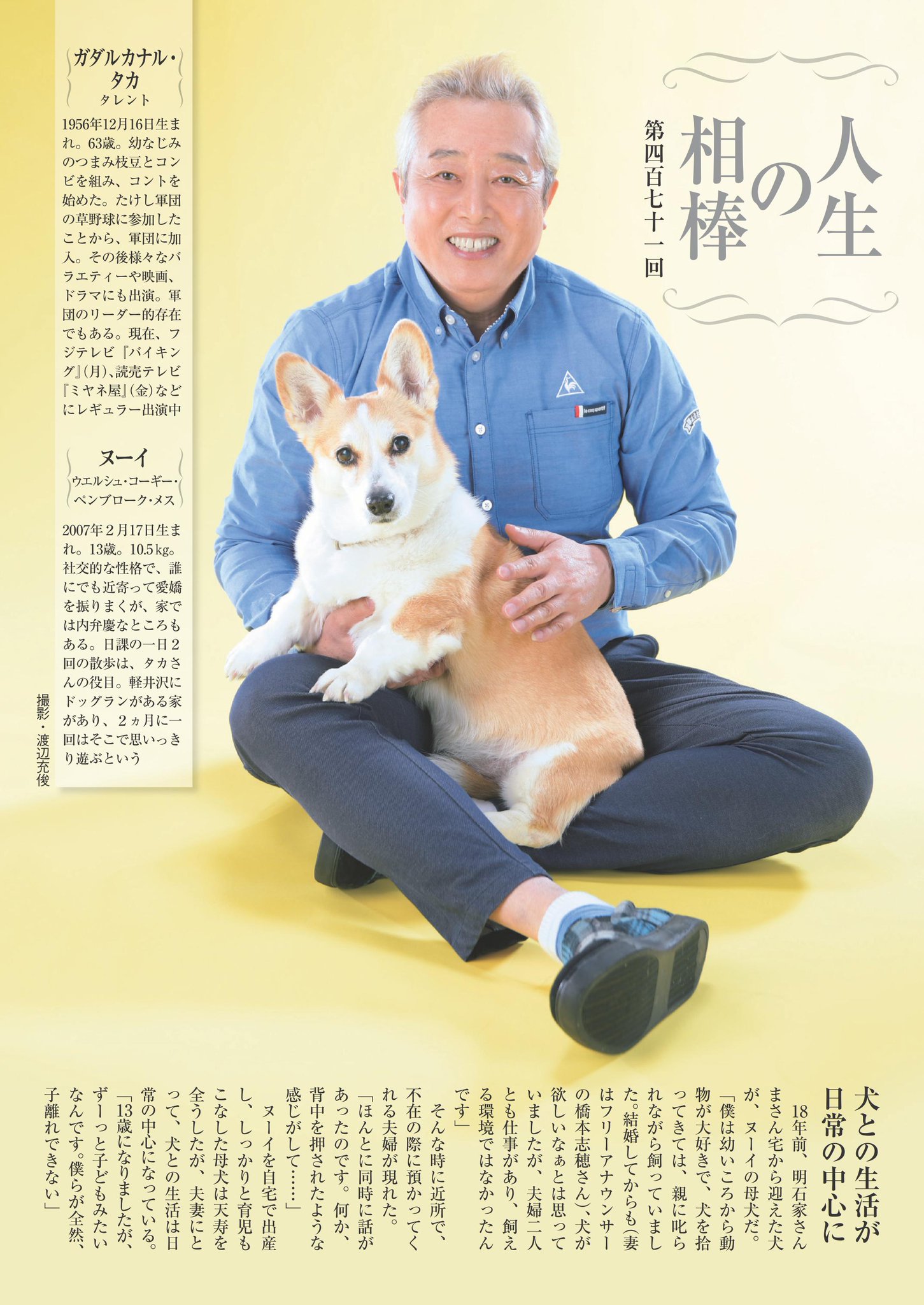 週刊現代 Pa Twitter 今号の連載 人生の相棒 は タレント ガダルカナル タカ さんが ウエルシュ コーギー ペンブローク のヌーイちゃんとともに登場 13歳になりましたが ずーっと子どもみたいなんです 僕らが全然 子離れできない わんこ