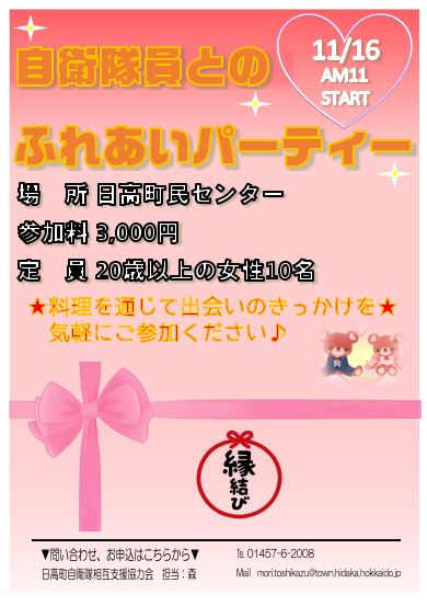 北海道日高町で行われる、現役自衛官との婚活・恋活イベント。1対1での個別対話やレクリエーションが催され、連絡先交換は自由となっている。会場までは送迎バスがついている。申込期限11月3日。主催:日高町自… 住所沙流郡日高町松風町1丁目116 ジャンルその他のイベント 電話-6-08. 「自衛隊説明会のご案内」「高田地域事務所 陸海空自衛官説明会」 .8.10 「令和2年度一般幹部候補生(海上自衛隊飛行要員)採用第2次試験合格者」が掲載されました。 .8.7 「元戦車中隊長の模型部屋」「護衛艦『みょうこう』」 .8.7. 自衛隊ふれあいの会とは 日本官婚推進協会では、月2回程度開催する『官婚の会』や『ミニ官婚の会』にて多くの自衛隊員の皆様にご参加頂いておりますが、 これとは別に日本官婚推進協会と自衛隊駐屯地との共催した婚活パーティー、『ふれあいの会』を.